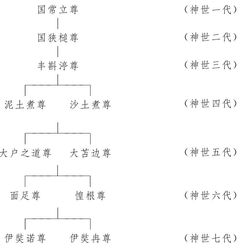 用白话文表述:在远古时代,天地是连在一起的,阴阳不分,混沌得像个鸡蛋。天如蛋清,地如蛋黄,先有天,后有地,神圣就生在天地间。当时,天地中生出一个形状如芦苇芽的物体并衍化为神,名号为国常立尊。所以,古代日本又称“苇原中国”,相对于“高天原”(天上的世界)和“黄泉国”(地下的世界)。之后,他生出了国狭槌尊,国狭槌尊又生出了丰斟渟尊。这三尊神,国常立尊是最高主宰,国狭槌尊掌管天上万物的生育,丰斟渟尊掌管冥界。他们都是“乾道独化”。乾为阳,坤为阴,“乾道独化”即男性的单性繁殖。从第四代神即“神世四代”至“神世七代”,男神哥哥和女神妹妹都成双配对。“自国常立尊,迄伊奘诺尊、伊奘冉尊,是为神世七代者矣。”