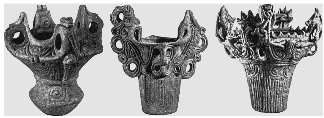 绳文时代的土器。自左至右:马高式(新溩县)、井户尻式(长野县)、胜坂式(东京都)