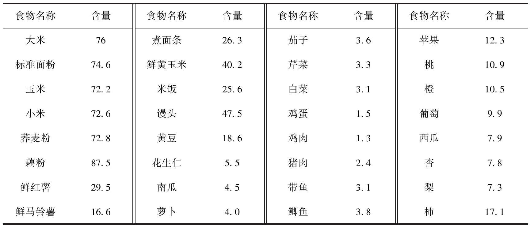 膳食中碳水化合物的主要来源是植物性食物,如谷类、薯类、根茎类蔬菜和豆类,另外是食用糖类。粮谷类一般含碳水化合物60%~80%,薯类中含量为15%~29%,豆类中为40%~60%。常见食物中碳水化合物的含量见表3-2。