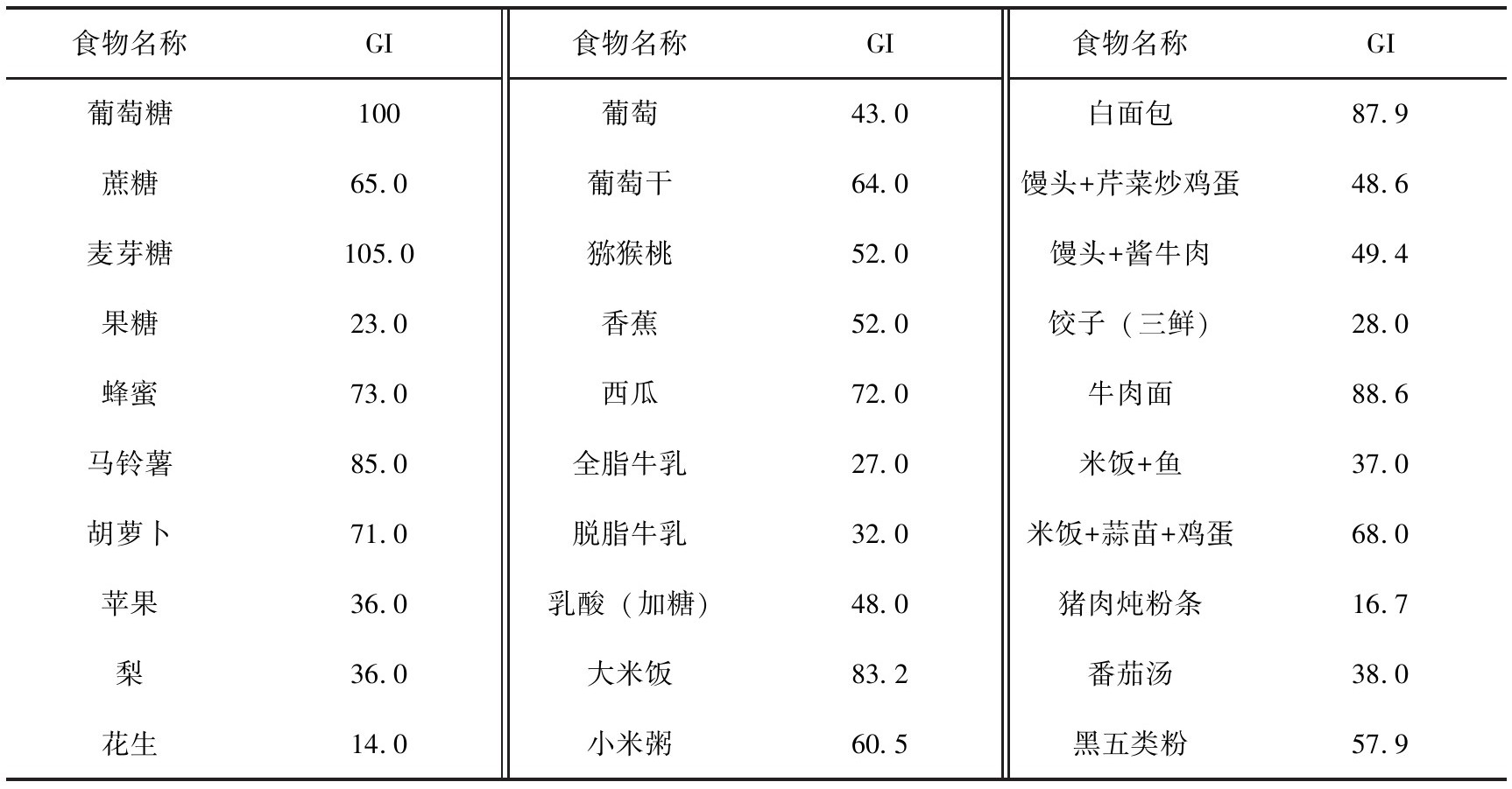 当GI在55以下时,该食物为低GI食物;当GI在55~70时,该食物为中等GI食物;当GI在70以上时,该食物为高GI食物。常见食物血糖生成指数见表3-1。