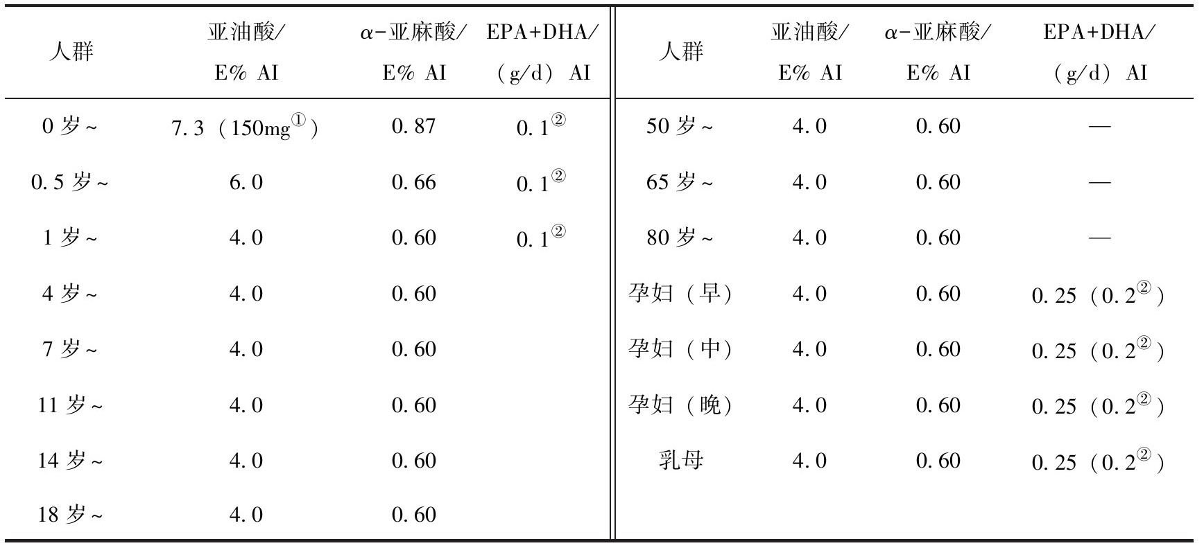 注:①为花生四烯酸;②为DHA;未指定参考值者用“—”表示;E%为占能量的百分百。