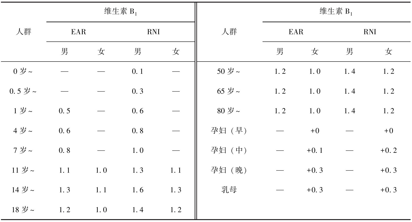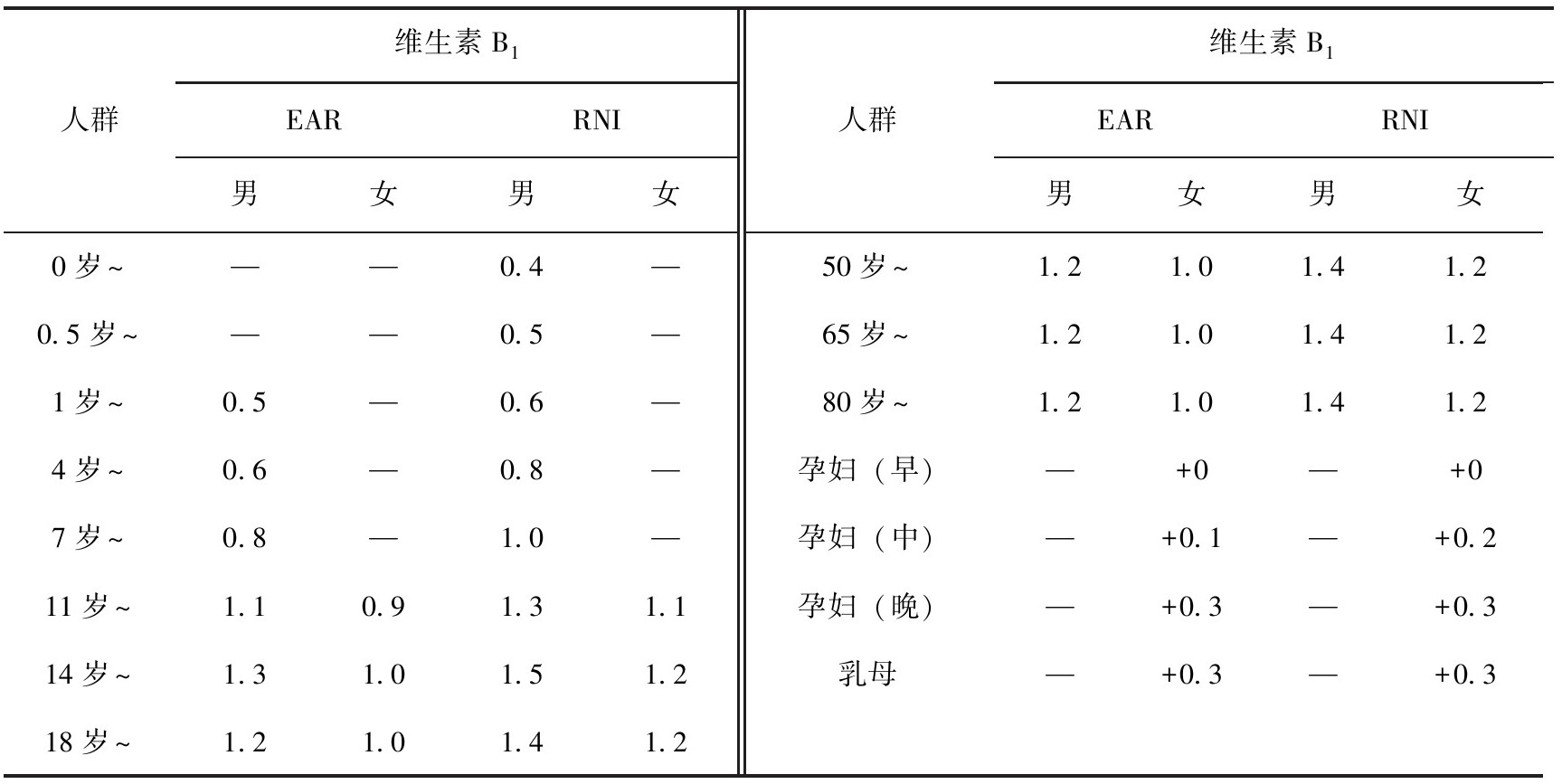 表3-14 中国居民膳食维生素B 1 参考摄入量