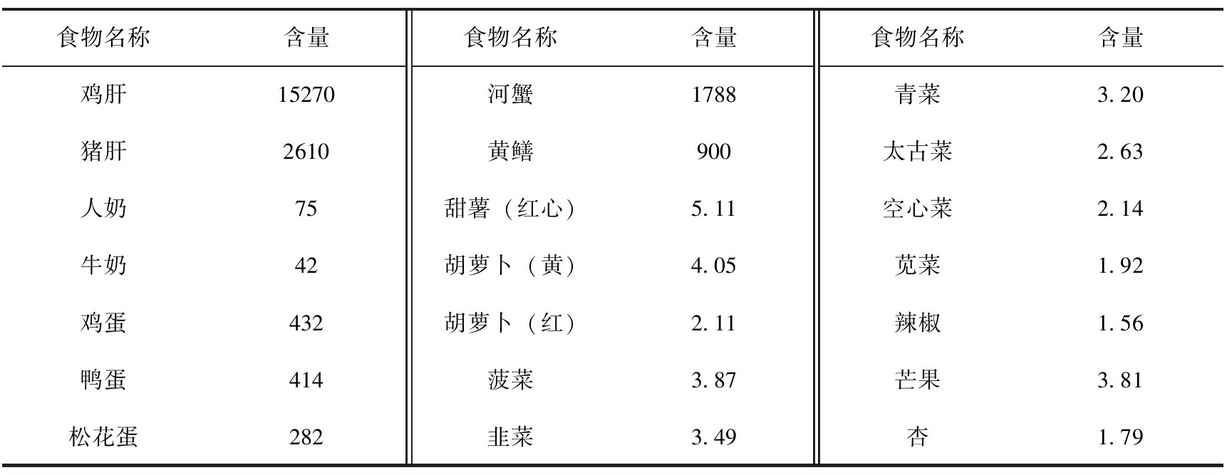 (2)食物来源。天然维生素A只存在于动物性食品中,如动物肝脏、蛋类、奶油和鱼肝油中;植物所含的胡萝卜素进入人体,可在肝中转变为维生素A(1mg胡萝卜素=0.167mg维生素A)。见表3-9,富含维生素A的食物主要有动物的肝脏、鱼类、海产品、奶油和鸡蛋等动物性食物。富含胡萝卜素的食物主要是橙黄色和绿色蔬菜。菠菜、胡萝卜、韭菜、油菜、荠菜、马兰头等每500g可含胡萝卜素14mg以上,每天只要吃120~150g就能满足儿童维生素A的需要。