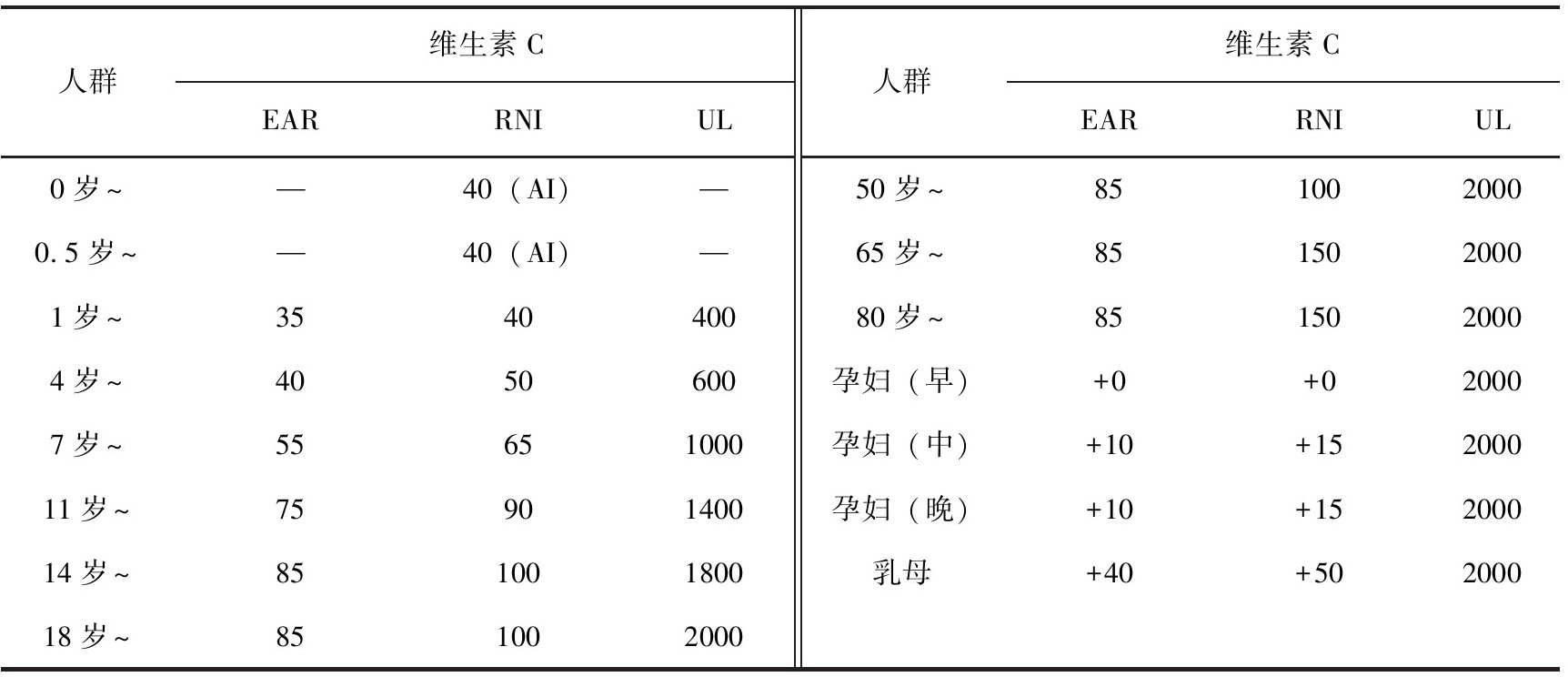 表3-13 中国居民膳食维生素C参考摄入量