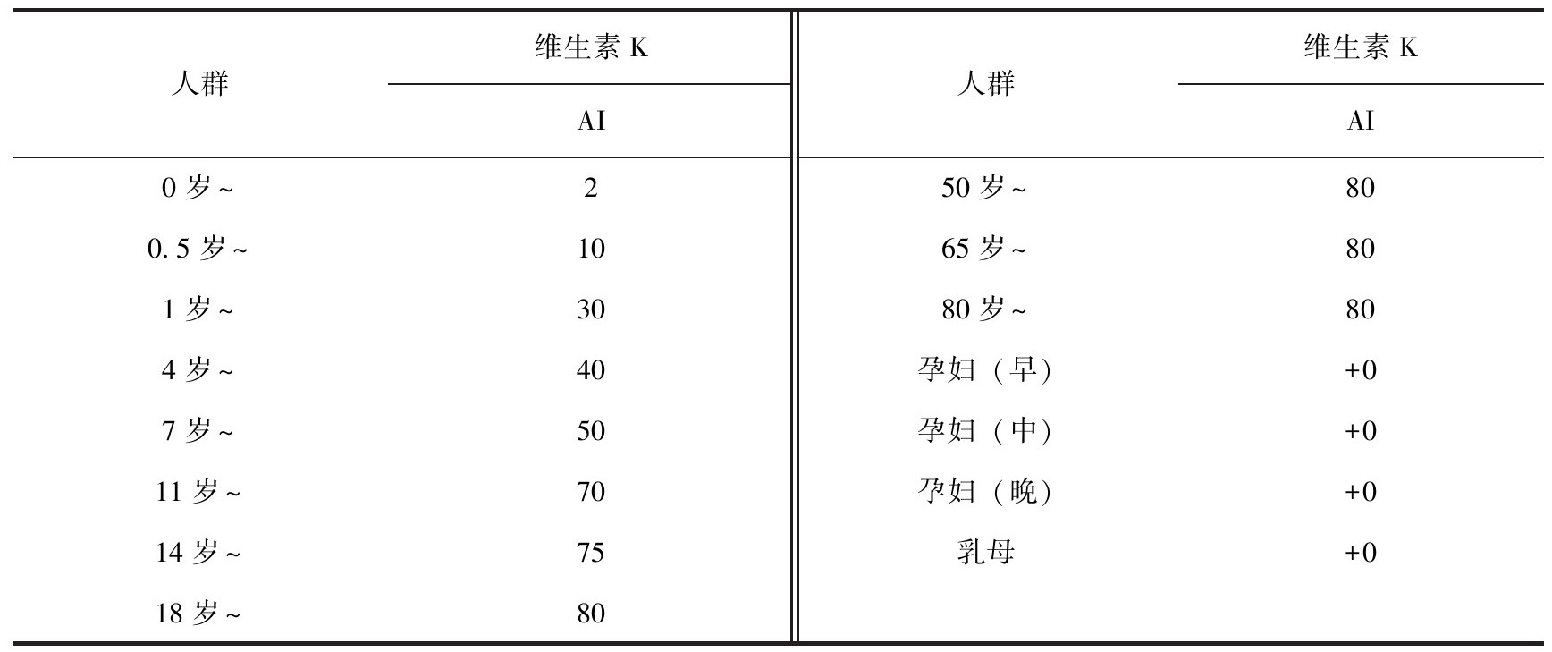 (1)推荐摄入量。中国居民膳食维生素K参考摄入量如表3-12所示。