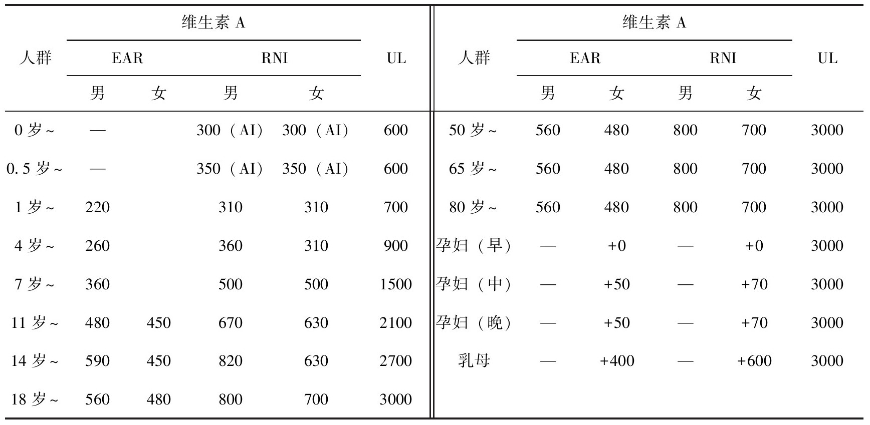 表3-8 中国居民膳食维生素A参考摄入量