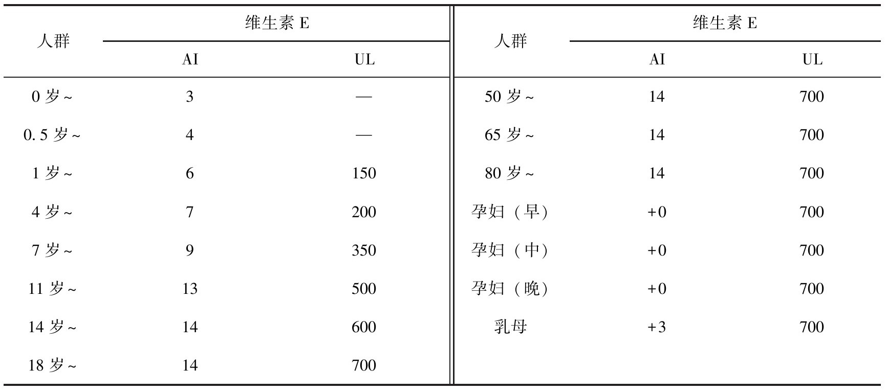 表3-11 中国居民膳食维生素E参考摄入量