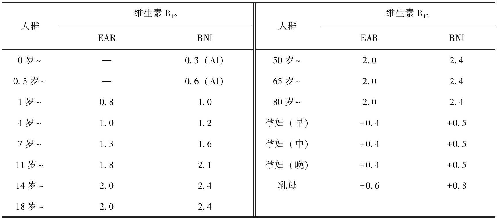 表3-18 中国居民膳食维生素B 12 参考摄入量