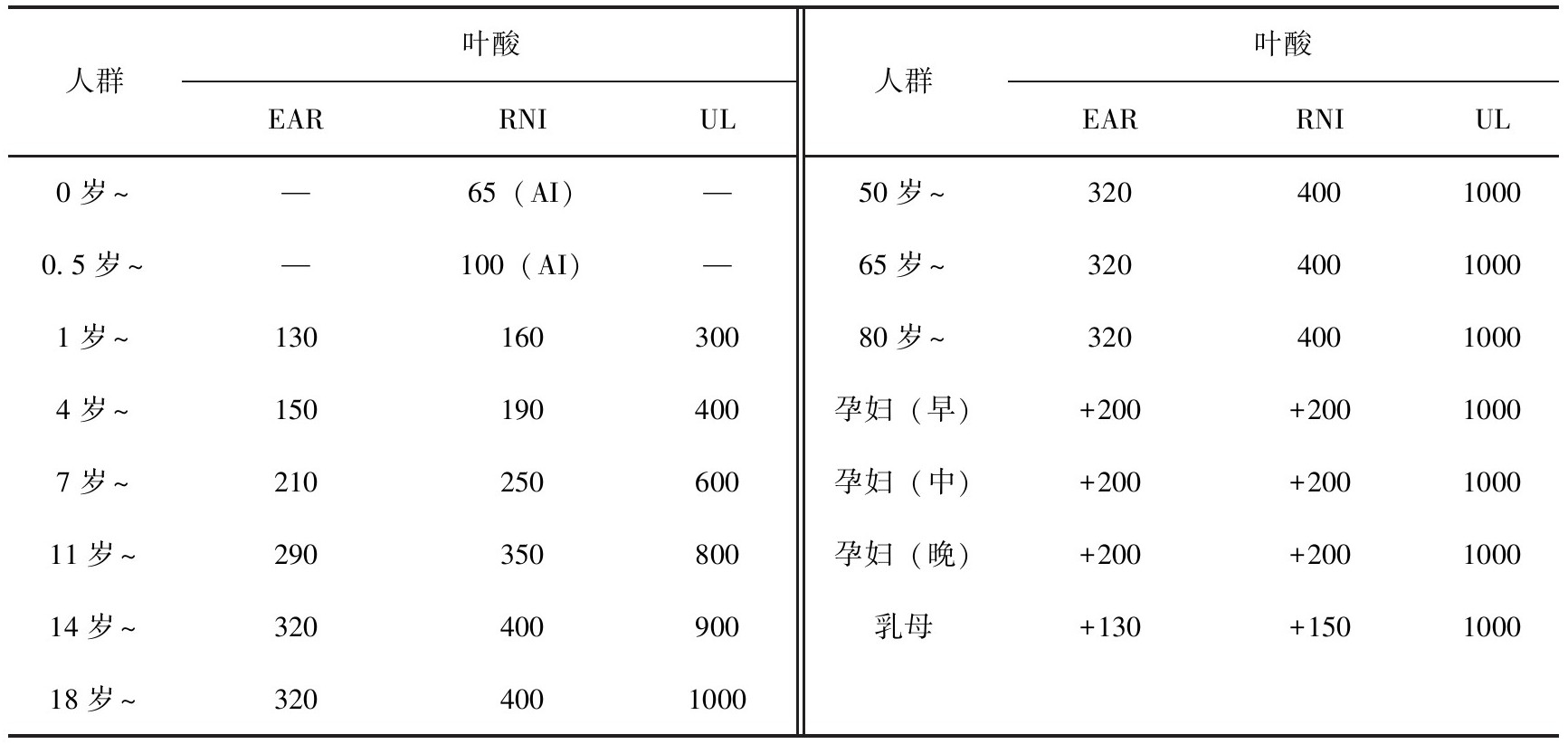 表3-17 中国居民膳食维生素叶酸参考摄入量