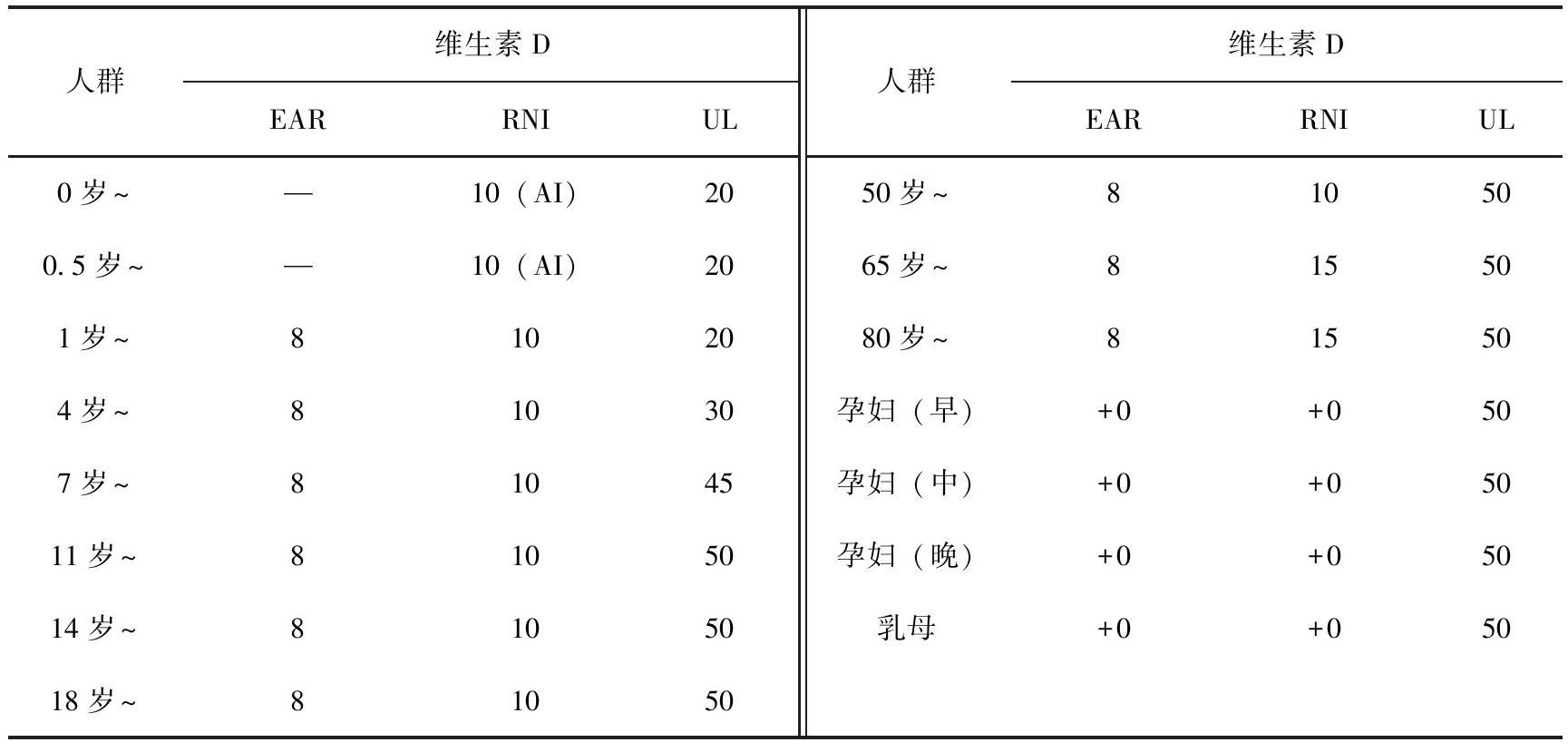 表3-10 中国居民膳食维生素D参考摄入量