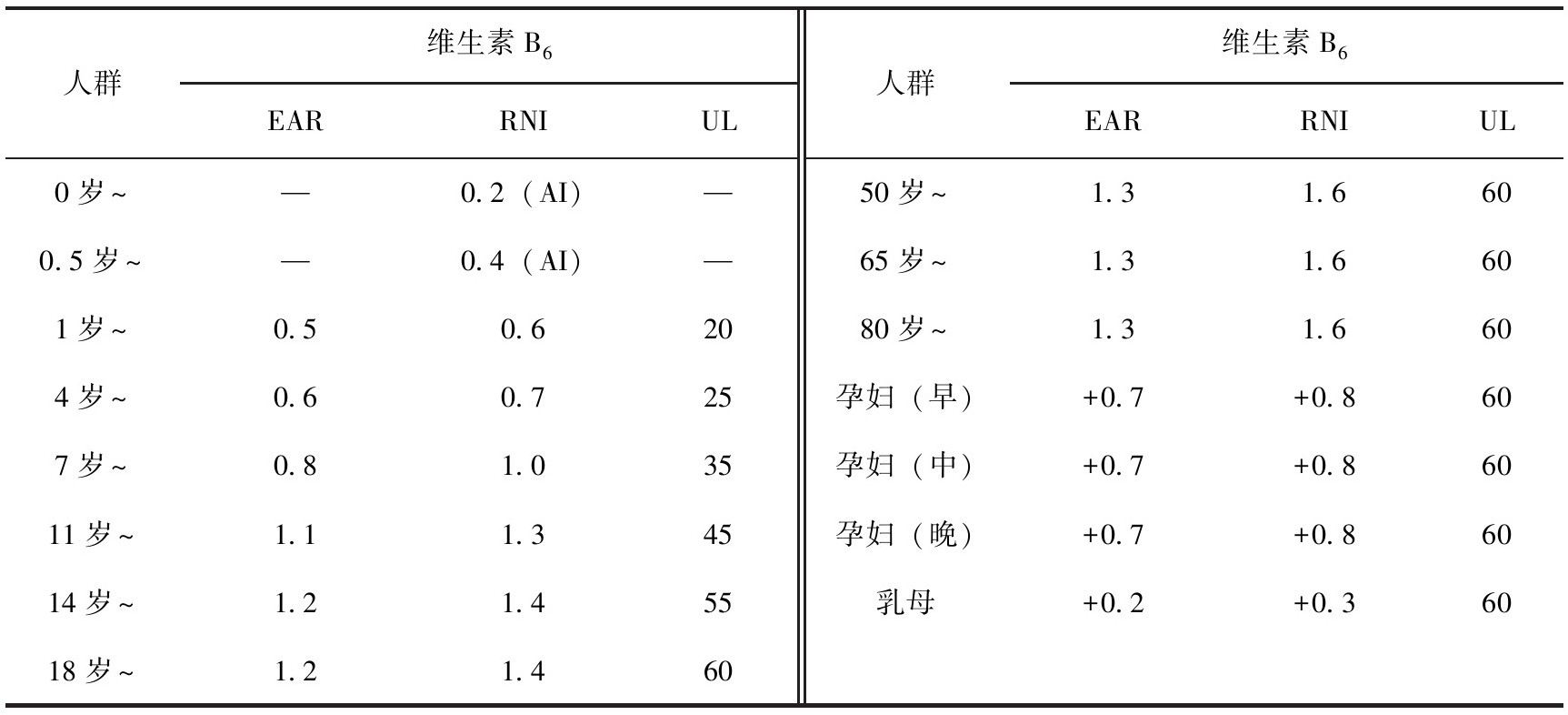 表3-16 中国居民膳食维生素B 6 参考摄入量