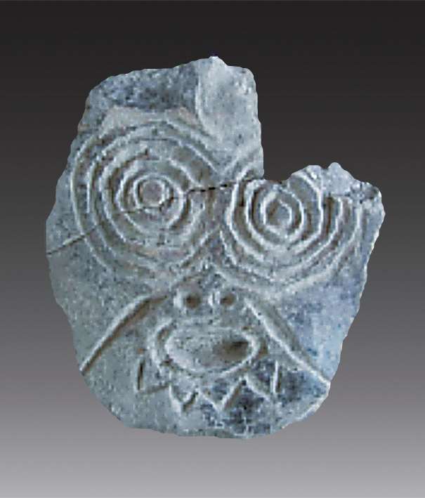 在双塔遗址一期地层出土的陶器中有1件“刻画人面纹陶片”尚未引起学界重视。至少其1万年的历史深度就足以为改写现行的中国艺术史、雕塑史和美学史等提供重要资料。用五个同心圆的形式来刻画眼睛,类似的表现手法也见于史前岩画,并通常被岩画研究者解读为先民想象的太阳神造像。值得关注的还有,从造型艺术的历史看,距今8000年的兴隆洼文化出现的浮雕玉人面作品,如内蒙古林西县白音长汗遗址出土的嵌蚌玉人面饰,原来也可以溯源于此。