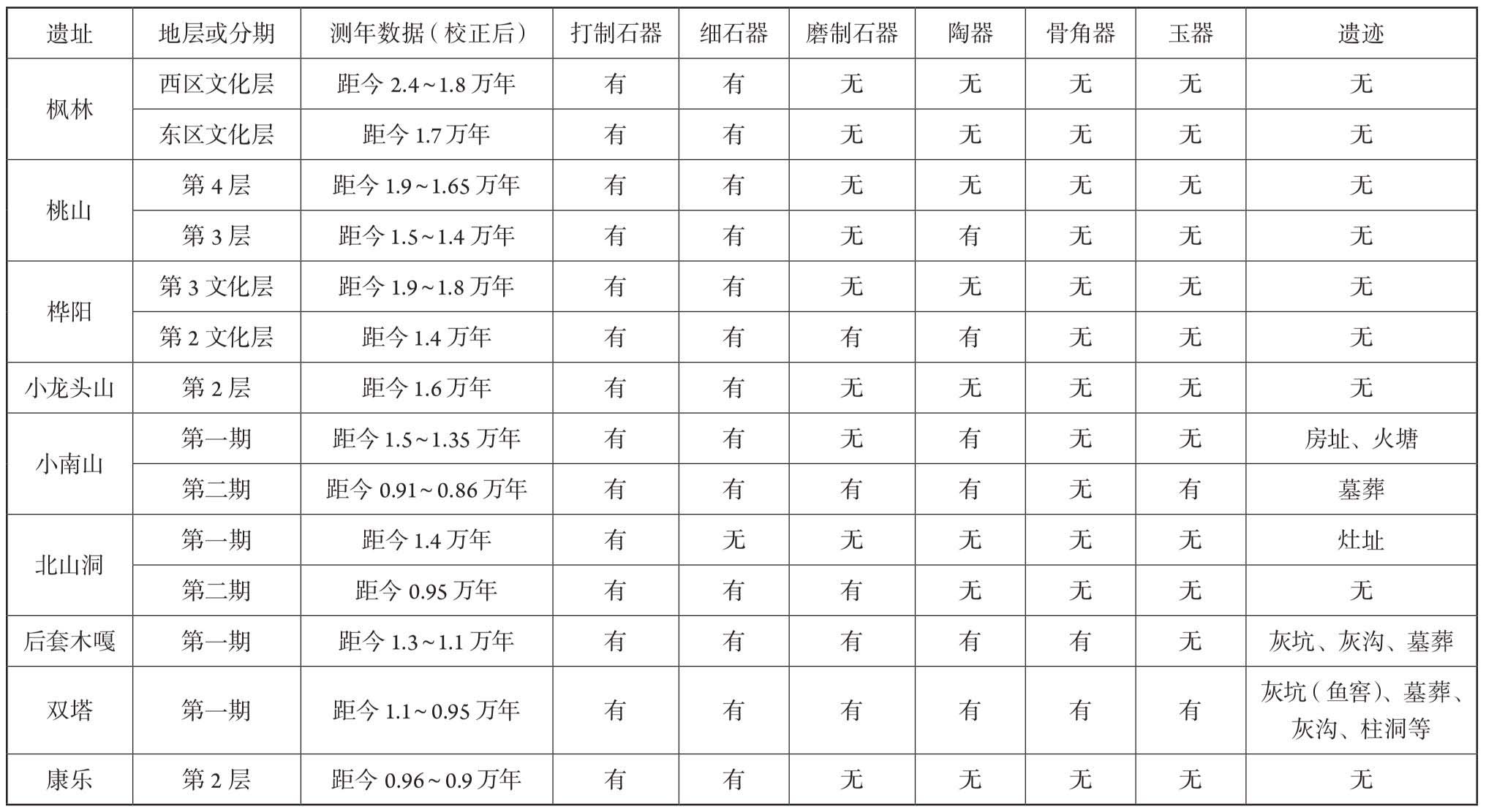 表中所列距今2万—9000年前遗址共9个。本章讨论的双塔遗址和小南山遗址均在其列。若将讨论范围扩大到包括辽宁省的话,那么海城小孤山遗址也会入选。通过这个背景时空的鉴照,玉文化为何率先出现在东北而不出现在其他地区的问题,就有了思考和讨论的依据。一般而言,我国的玉器生产没有在旧石器时代出现,而是在新石器时代出现。率先进入定居农耕生产的史前社会未必具备生产玉器的条件;没有进入农耕社会式定居生活,却进入渔猎为主的定居生活方式,相对而言更容易催生玉文化的出现。这就是自然条件加生产方式所决定的玉文化肇端的情况。