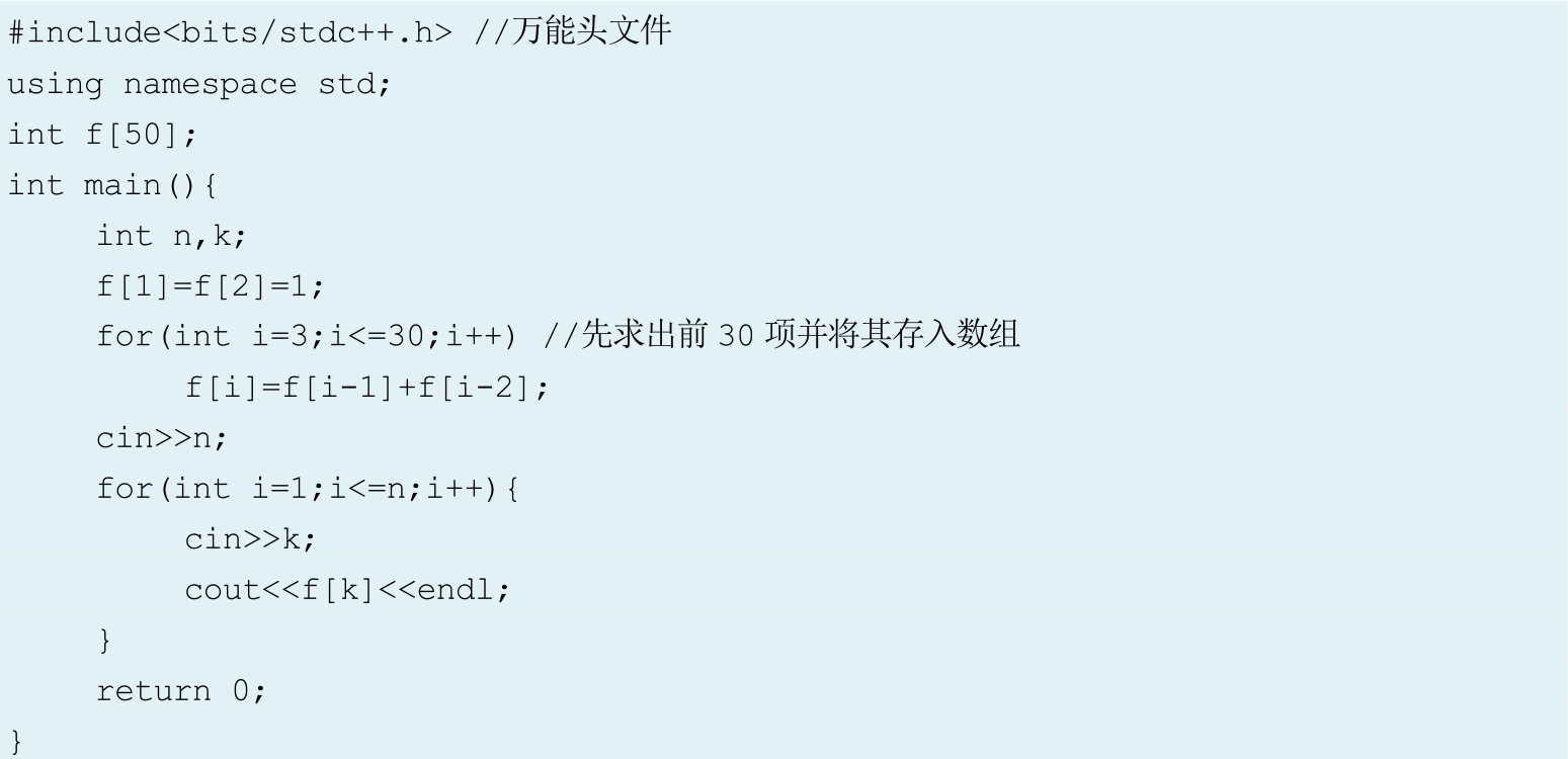 训练17(B2064): 斐波那契数列的第1个数和第2个数都为1,接下来的每个数都等于前面两个数之和。下面的程序包含 n 行输入,每行都为一个正整数 k (1≤ k ≤30),请输出斐波那契数列中的第 k 个数。