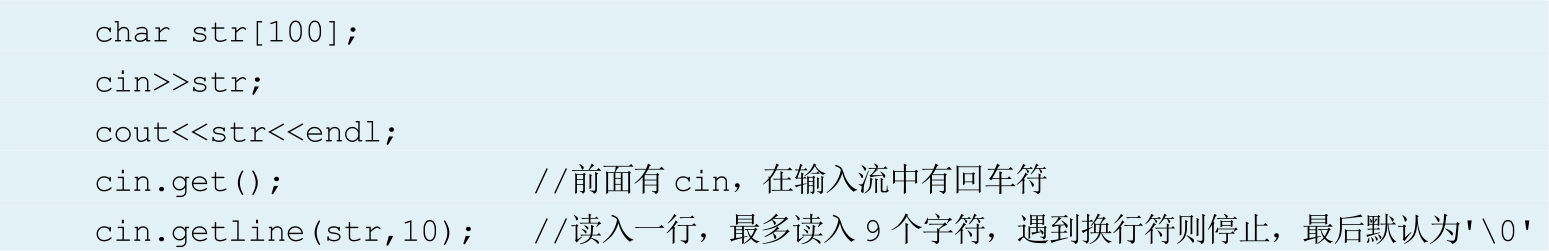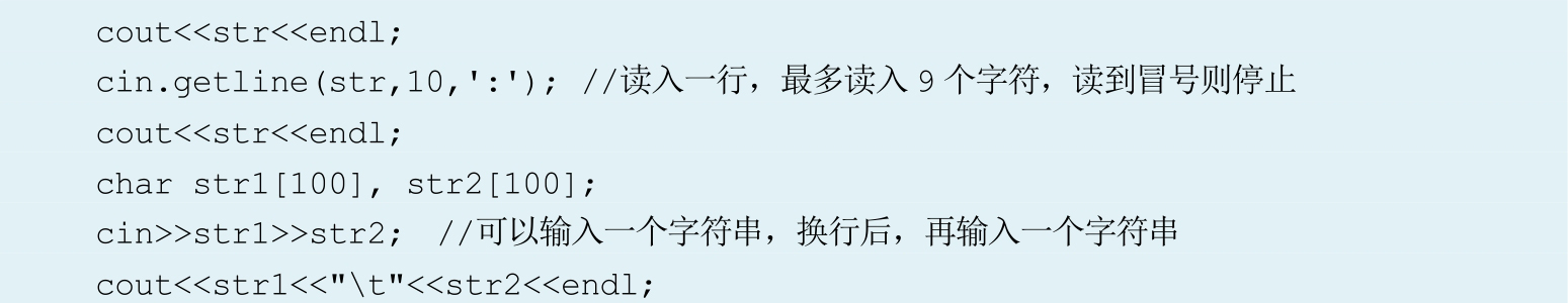 ●cin.getline():读取一行,遇到分隔符则结束(默认为换行符),丢弃换行符。