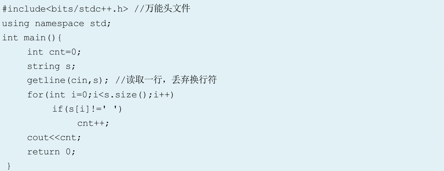 训练19(P5015) :统计在作文的标题中有多少个字符。在标题中可能有大、小写英文字母,以及数字、空格和换行符。在统计字符数时,空格和换行符不计算在内。