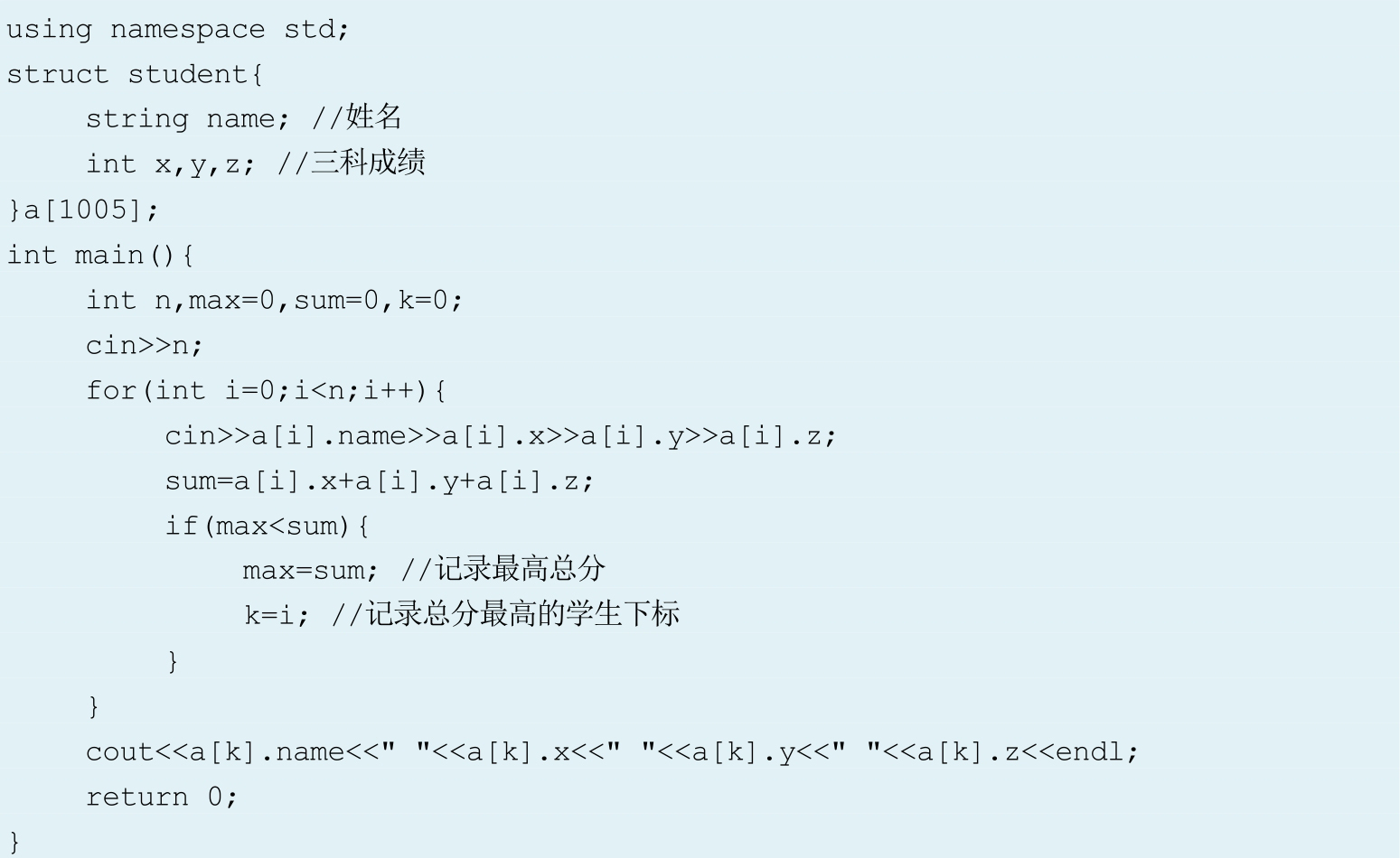 训练20(P5740): 现有 n 名学生参加了期末考试,并且已经收集到每名学生的信息:姓名(不超过8个字符的仅有英文小写字母的字符串)及语文、数学、英语成绩(均为不超过150的自然数)。请输出总分最高的学生的各项信息(姓名、各科成绩)。若有多个总分最高的学生,则输出原始名单靠前的那位。