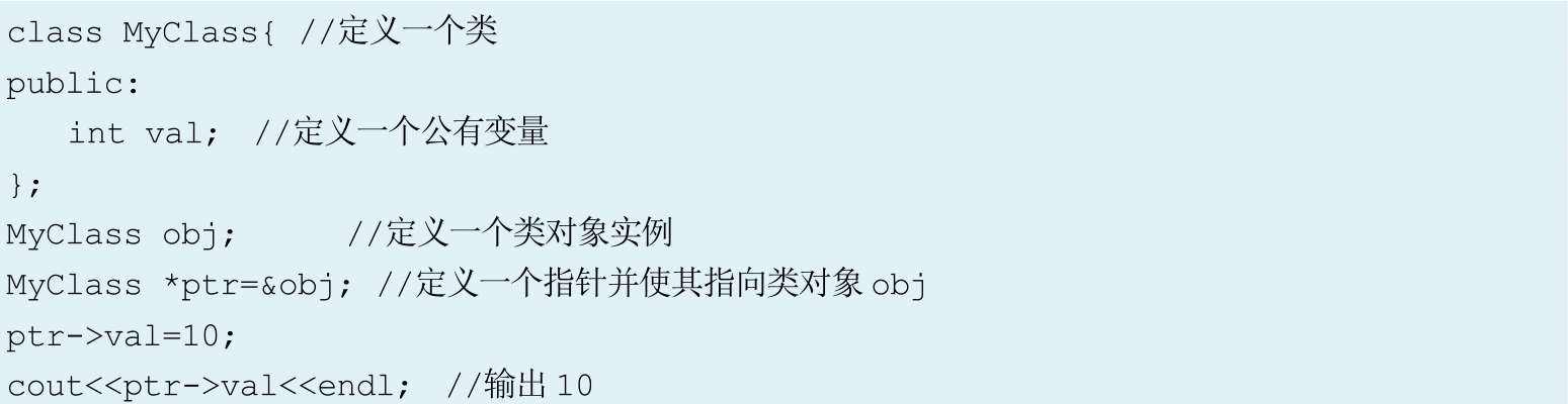 定义一个指针,指向类对象,通过指针调用该类对象的成员。