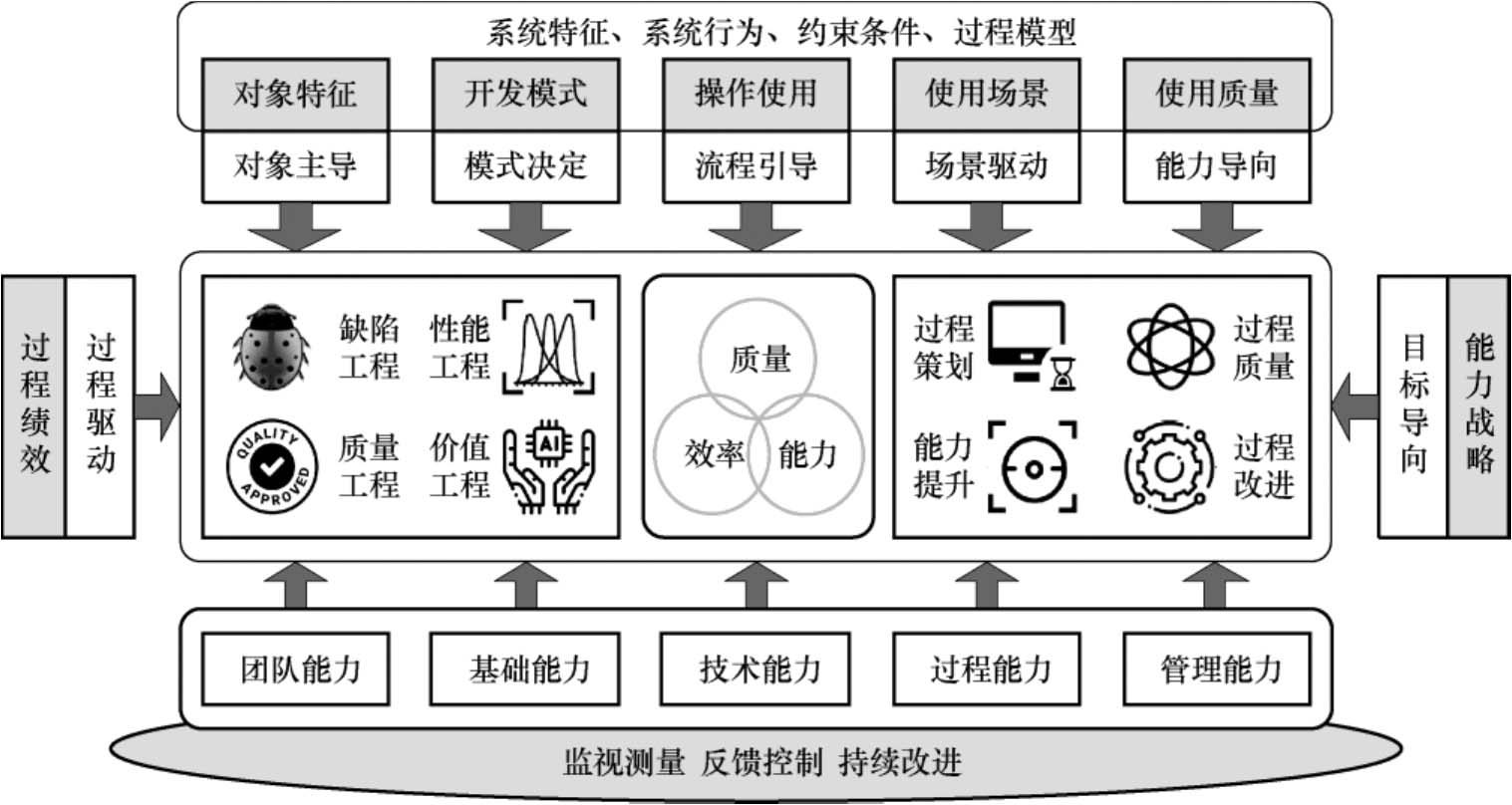 (4) 过程观: 基于软件测试过程模型,进行过程策划、过程设计、过程改进、能力提升,建立监视测量及反馈控制机制,持续改进测试过程质量,提升过程能力。