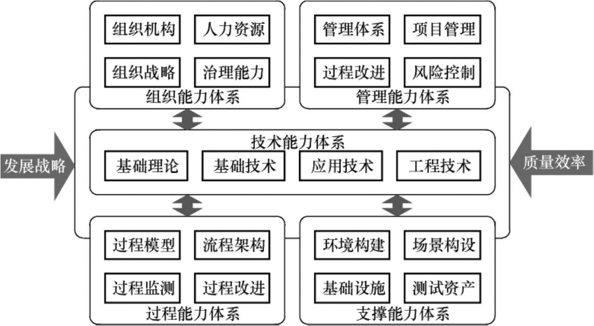 软件测试是对软件生命周期过程中各阶段构建的体系架构模型、功能结构模型、业务流程模型、数据关系模型、系统行为模型等以形式化方法和工具进行模型检测的过程活动。软件测试基础能力体系由技术能力体系、组织能力体系、管理能力体系、过程能力体系及支撑能力体系组成。软件测试基础能力体系如图4-5所示。