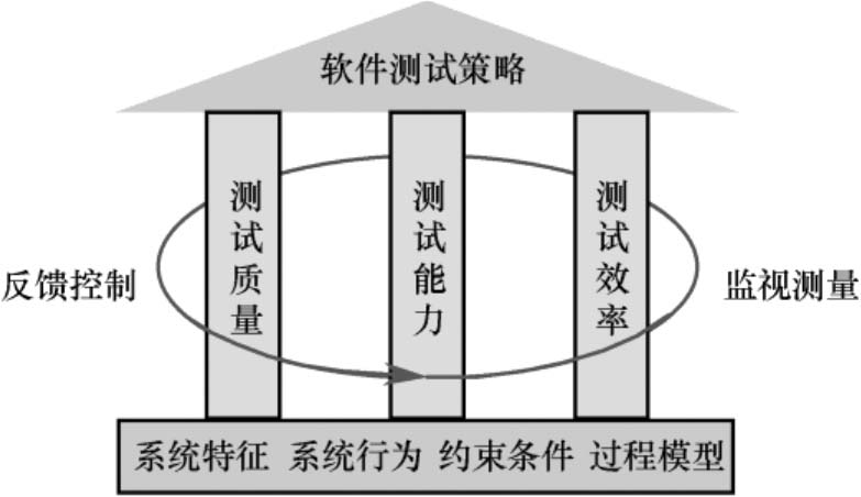 对于一个确定的系统,软件测试策略解决的问题是:基于系统规格和需求规格确定测试需求,基于用户需求验证系统能力,基于系统架构确定测试级别,基于可靠性、安全性等级确定测试类型,基于功能分解确定测试项,基于质量目标确定测试充分性准则,基于质量风险确定测试次序,基于运行环境构建测试环境,基于测试技术确定测试方法,基于抽样理论及统计技术进行测试分析。以软件系统的特征、行为、约束条件、过程模型为基础,以质量、效率、能力为驱动,构建如图4-1所示的开放、融合的软件测试策略框架。
