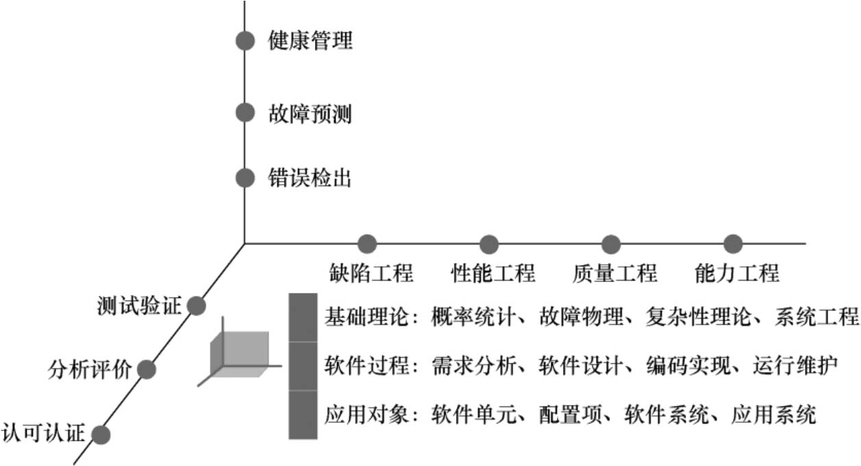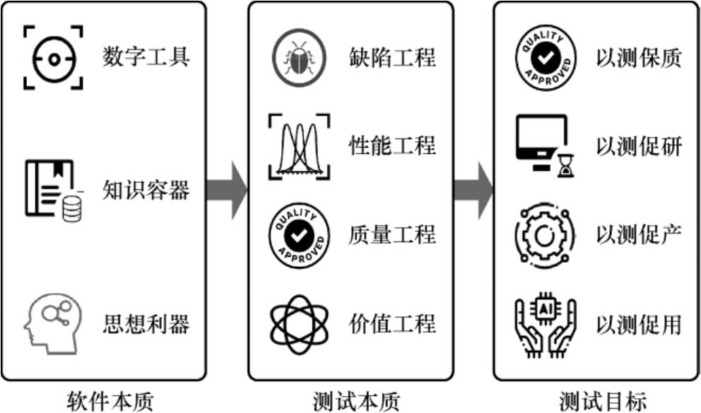 在一个放大的空间和时间尺度上,软件测试不再局限于错误检出和符合性验证,而是面向用户、面向对象、面向过程,以测保质、以测促研、以测促产、以测促用,形成新发展阶段的软件测试使命。软件测试目标体系如图4-3所示。