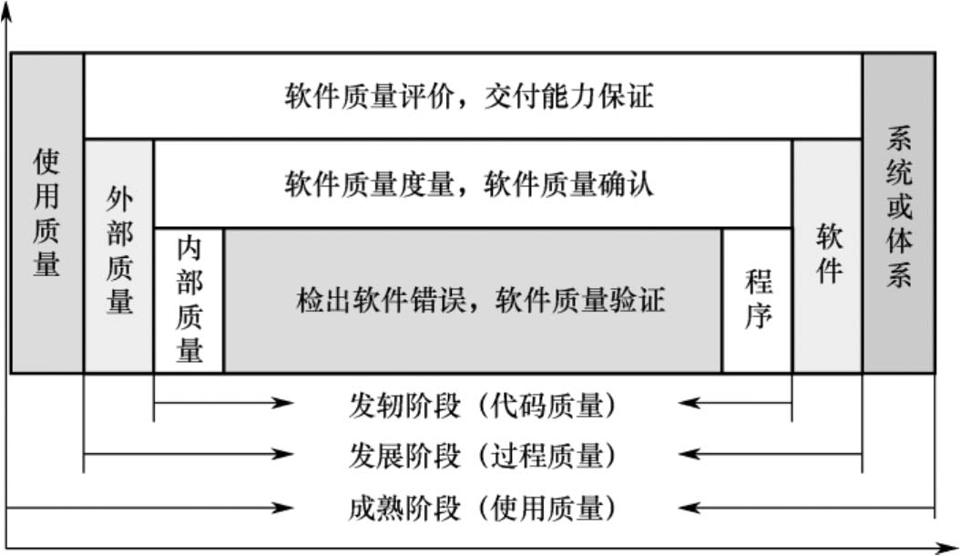 软件测试是软件质量保证的重要子域,其根本目的是检出错误并验证系统的符合性。这是软件测试的初心。这里,在对系统特征、系统行为、约束条件、质量要求、潜在风险及测试能力等进行综合审视的基础上,将软件形态、测试目标同软件生命周期过程融合,构建一个旨在识别、度量、评价被测软件系统及测试过程改进的、基于测试驱动的软件质量架构,为测试策略制定及基于测试驱动的软件质量工程最佳实践提供支撑。基于测试驱动的软件质量架构如图4-6所示。