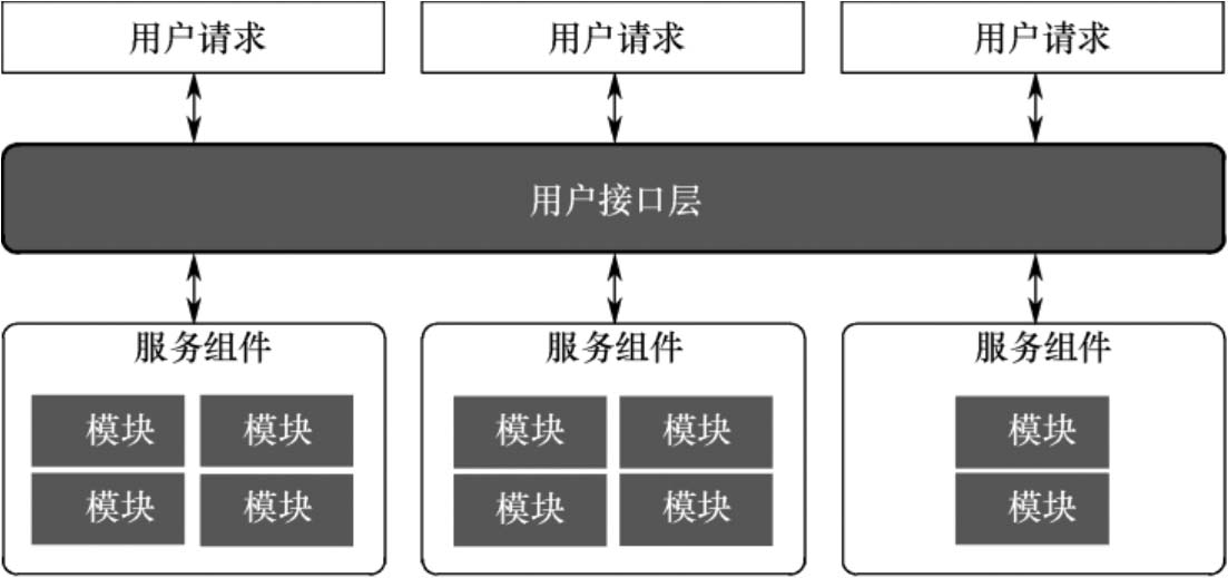表现层用于实现用户界面,负责视觉和用户交互;业务层用于实现系统业务逻辑;持久层提供相应的数据,其中,SQL语句就放在这一层;数据库层用于保存数据。用户请求将依次通过这四层的处理,不能跳过任何一层。可以在业务层和持久层之间,增加一个服务层,为不同业务逻辑提供通用接口。分层架构用户请求流程如图4-11所示。