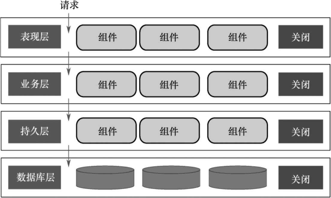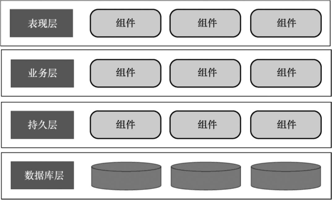 分层架构(Layered Architecture)将软件系统划分为若干水平层,每一层都具有清晰的角色定义和分工,各层之间通过接口实现通信和交互。图4-10给出了一个常见四层结构的分层架构。