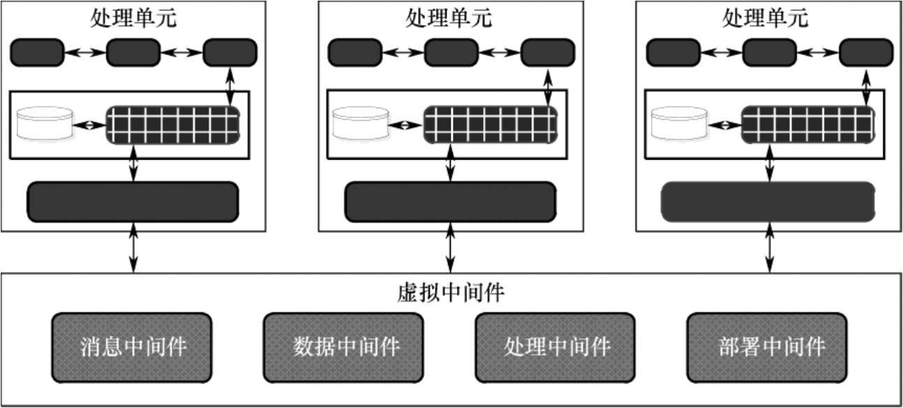 云架构(Cloud Architecture)是指将构建云所需组件及功能连接起来,提供应用运行的在线平台。通常,云架构包括处理单元和虚拟中间件两部分。处理单元实现业务逻辑,虚拟中间件负责通信、保持Sessions、数据复制、分布式处理和处理单元部署等任务。虚拟中间件包含消息中间件、数据中间件、处理中间件、部署中间件四个组件。云架构如图4-14所示。