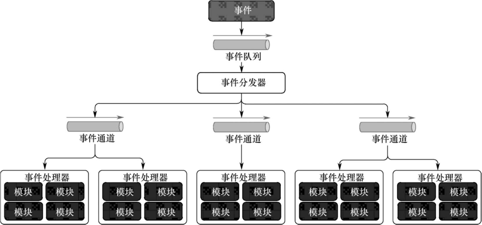 事件驱动架构(Event-driven Architecture)是通过事件通信的分布式异步软件架构,由事件队列、事件分发器、事件通道、事件处理器四部分构成。事件队列是接收事件的入口,事件分发器负责将不同事件分发到不同业务逻辑单元,事件通道是事件分发器与事件处理器之间的连接渠道,事件处理器实现业务逻辑,处理完成后发出事件,触发下一步操作。事件驱动架构涉及异步编程,需要考虑远程通信、失去响应等情况,涉及多个处理器,很难回滚,难以支持原子性操作。事件驱动架构如图4-12所示。