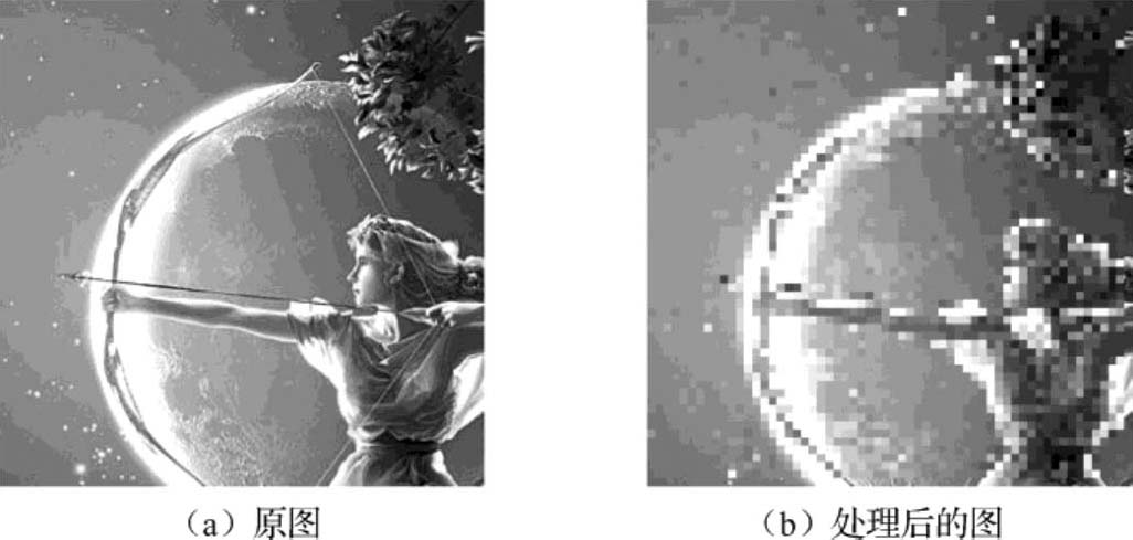 马赛克效果,其原理是将图像从形式上划分为很多小块,在每块内的各个像素都取到相同的红、绿、蓝颜色分量值,从而对某些细节进行模糊化处理,使图像粗糙化。