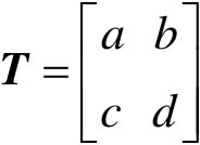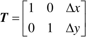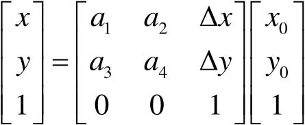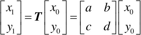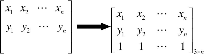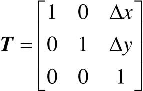 该变换不能表示为变换矩阵 T ×变换前的点集矩阵的形式,由于矩阵 T 中没有引入平移常量,故无论 a 、 b 、 c 、 d 取什么值,都不能实现平移功能。为了用统一的矩阵线性变换形式表示和实现几何变换,将 T 矩阵扩展为如下2×3的变换矩阵: