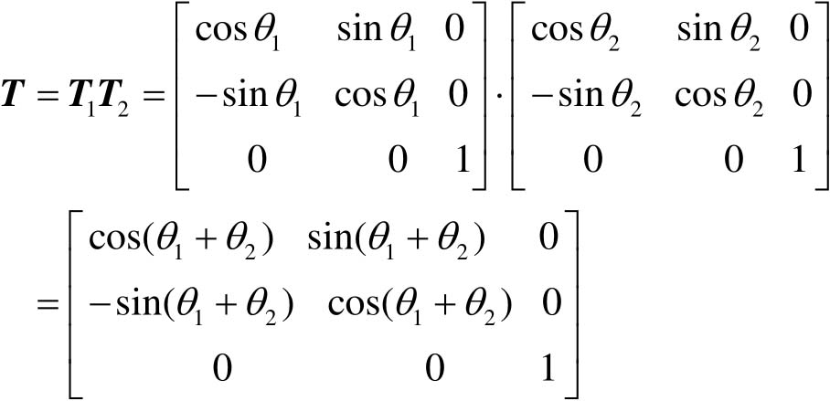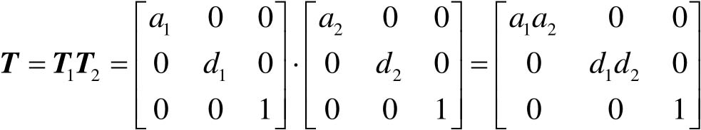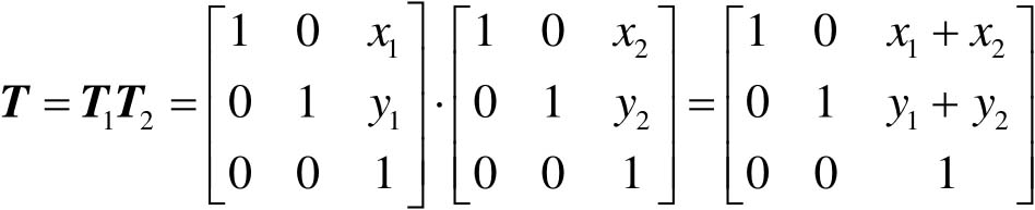 对给定的图像连续施行若干次的平移、镜像、缩放、旋转等基本变换 F 1 , F 2 ,…, F N 后,所完成的变换称为复合变换。复合变换的矩阵等于基本变换的矩阵按顺序相乘得到的组合矩阵,又叫级联变换。若干次基本变换仍可用3×3阶方阵表示。