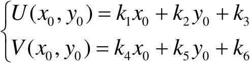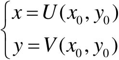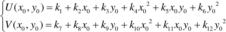 式中, x , y 分别表示输出图像像素的横、纵坐标; x 0 , y 0 分别表示输入图像像素的横、纵坐标;而 U , V 表示两种映射关系,通过输入的 x 0 和 y 0 来确定相应的 x 和 y 。