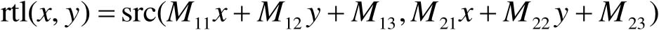 对于仿射变换后的图像 R ,可以由变换矩阵 M 与原始图像矩阵相乘得到。