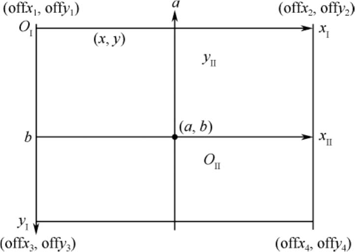 下面首先推导坐标系平移的转换公式。如图4-11所示,将坐标系Ⅰ平移到坐标系Ⅱ处,其中坐标系Ⅱ的原点在坐标系Ⅰ中坐标为( a , b )。