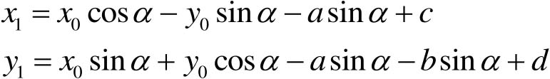 假设图像在新的坐标系下,以旋转后新图像左上角为坐标原点,未旋转时中心坐标为( a , b ),旋转后中心坐标为( c , d ),则旋转变换矩阵表达式为:
