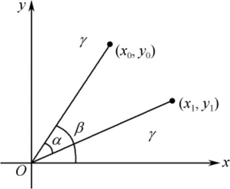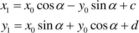 和图像平移一样,既可以把转出显示区域的图像截去,也可以扩大图像范围以显示所有的图像。如图4-10所示,点( x 0 , y 0 ) 经过旋转 α 度后坐标变成( x 1 , y 1 )。