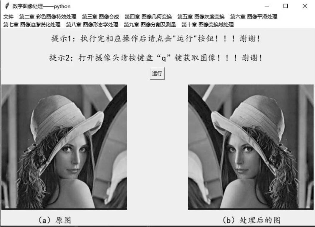 图像处理系统界面如图1-26所示,仿真系统界面含有Windows窗口、提示语、运行按钮、以章命名的菜单项、各章对应算法的子菜单项、子菜单项消息映射响应函数、处理前及处理后的图像显示等要素。系统界面中间部分包含左右两个图片对象,左边图片对象来自系统自带的图像、应用者选择的图像或者摄像头拍摄的图像,右边图片对象是用某一种算法处理后的图像;通过左右对比,可加深了解算法的原理,进一步掌握算法的应用。界面上部添加了菜单对象,菜单顶层对应各章的算法主题;具体的菜单选项对应某种图像处理算法,通过回调(CallBack)函数实现功能。该系统形象直观地展示了算法的处理效果,并可以扩展和改进,具有很好的实用性和应用性。
