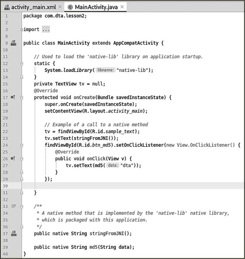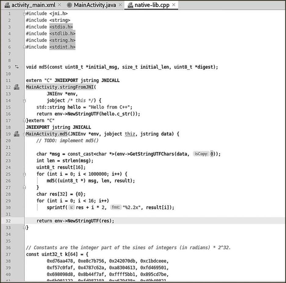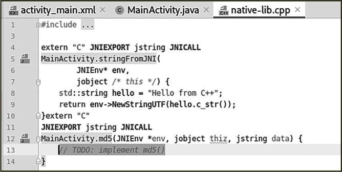 Android Studio会自动在native-lib.cpp中生成一个md5()方法的空实现,如图2—8所示。