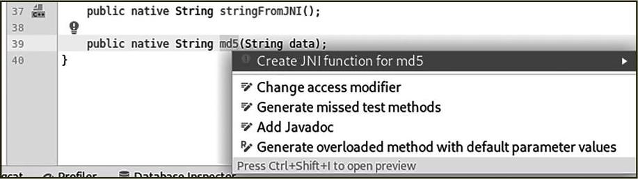 可以发现md5()方法名报红,这是因为编译器没有找到方法相应的实现。单击报红的函数名,然后使用组合键<Alt+Enter>选择Create JNI function for md5,如图2—7所示。
