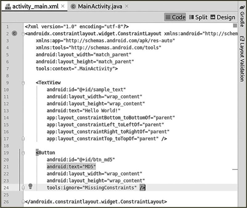 编写MainActivity.java代码,添加md5()方法并编写Button按钮的单击事件来调用该方法,如图2—6所示。