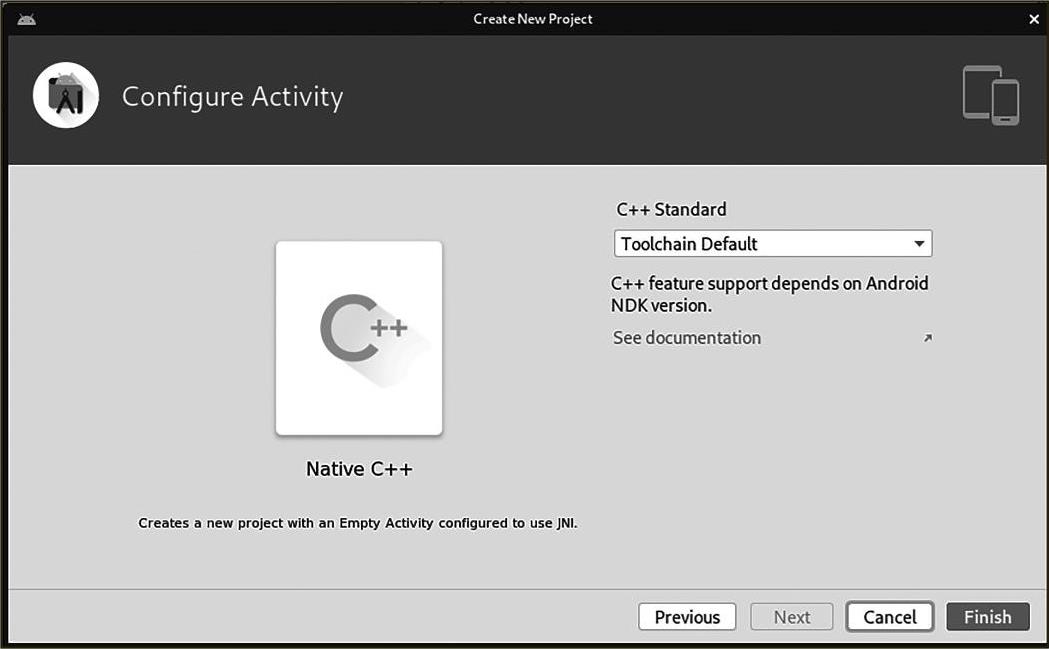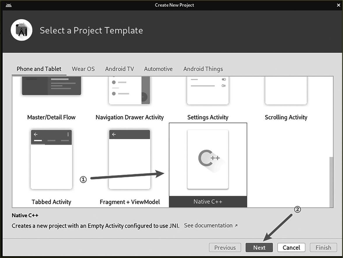 首先打开Android Studio,在菜单栏中依次选择File→New→New Project...来打开新建项目向导,选择相应的项目模板创建NDK项目,如图2—1所示。
