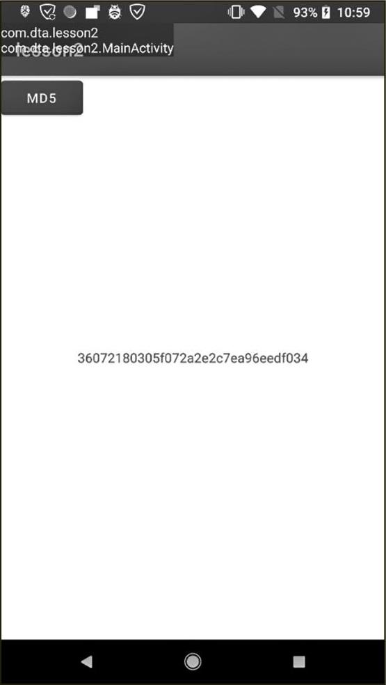 连接模拟器或者真机并运行,APK会自动编译并安装到目标计算机上。单击MD5按钮,TextView的内容会改变,如图2—10所示。