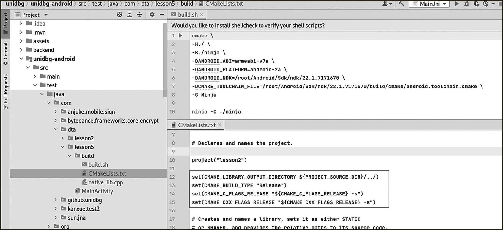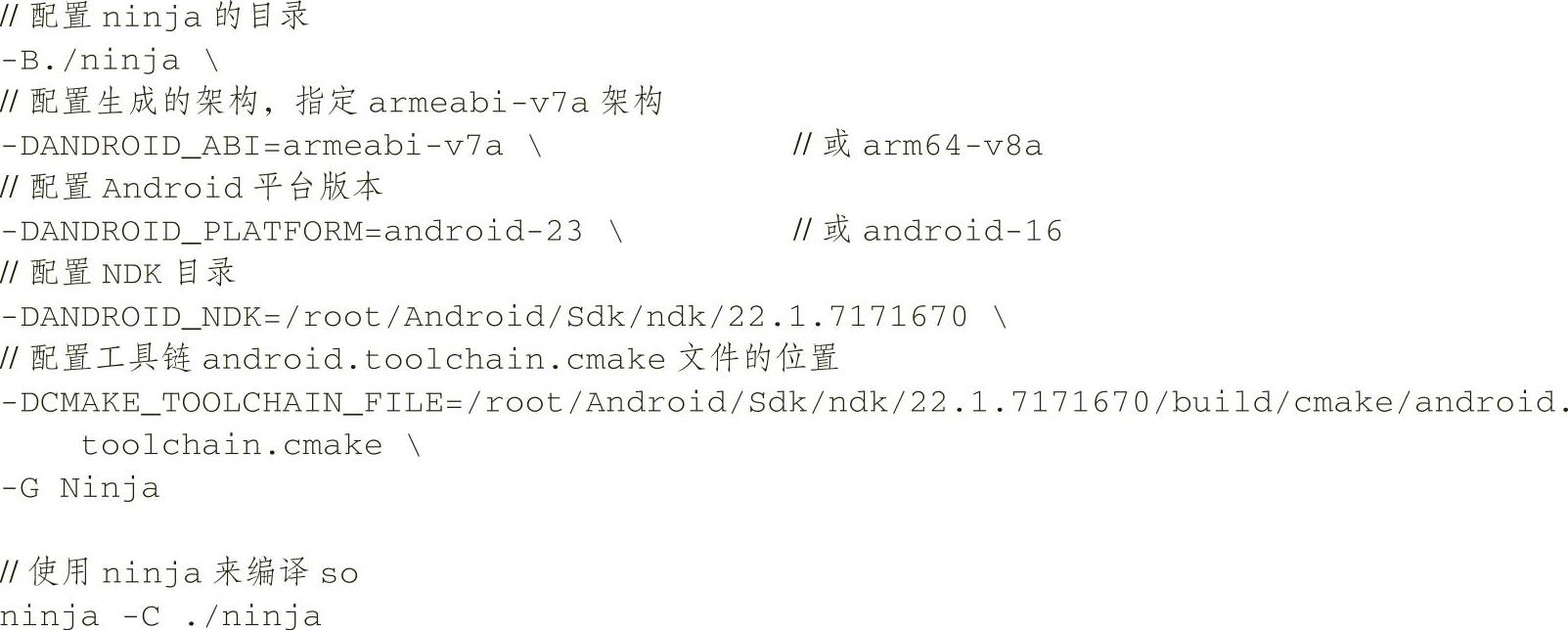 对于编译脚本的配置,Google官方已在文档中编写了示例,地址为https://developer.android.com/studio/projects/configure-cmake#call-cmake-cli,读者可自行参考。