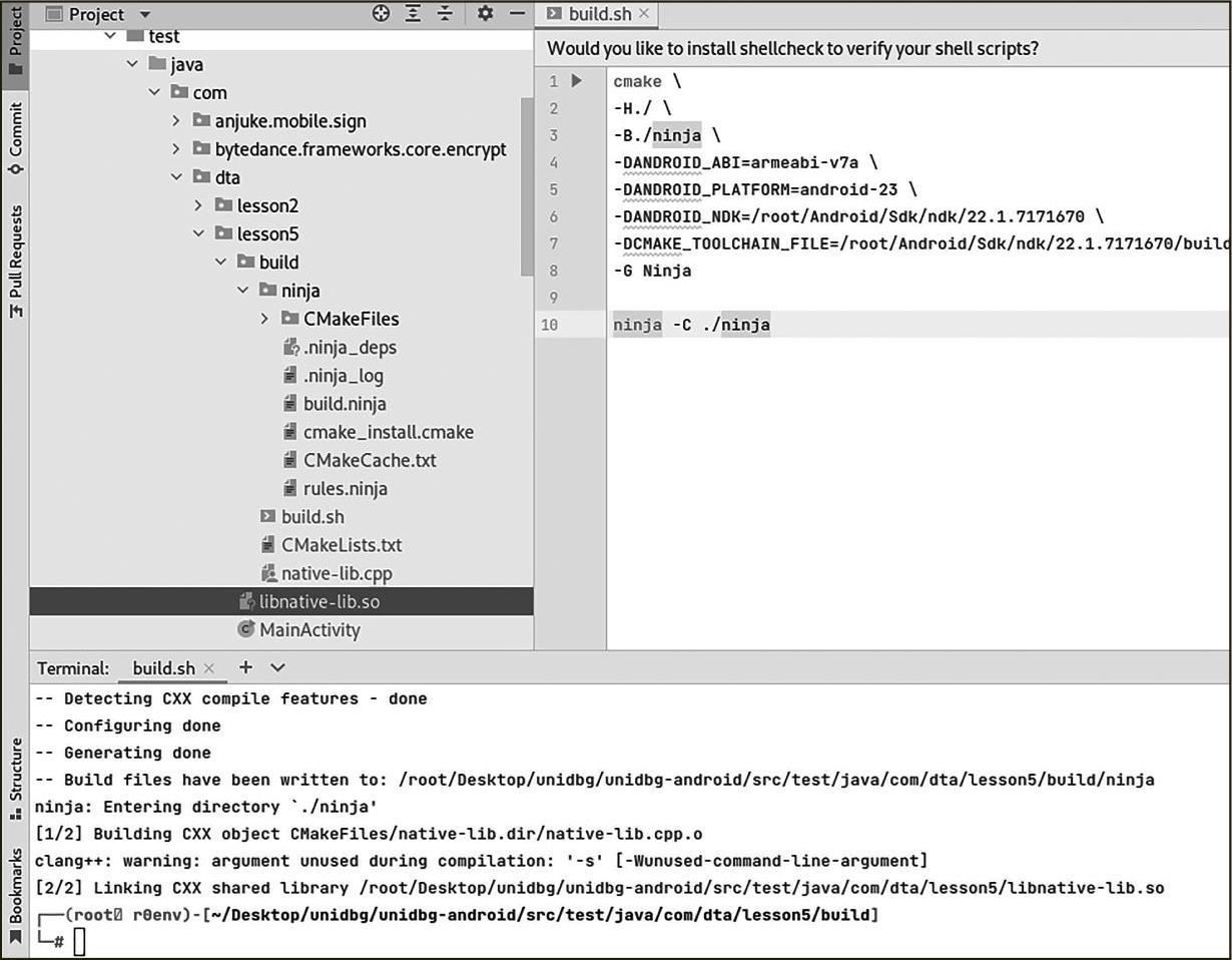 运行build.sh脚本,如果在build的同级目录下生成libnative-lib.so,则命令行编译成功,如图3—16所示。