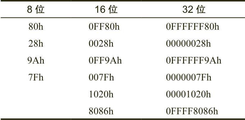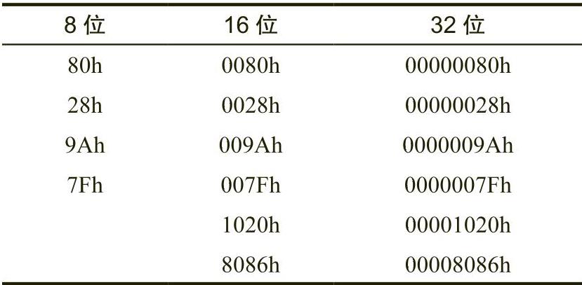 尽管可以提出一个强有力的论点,即内存或寄存器中的数是用二进制表示的,但最好将内存或寄存器中的值视为抽象的数字量(abstract numeric quantity)。128、80h或10000000b等符号串并不是不同的数字,它们只是同一抽象数字量的不同表示,我们称该量为一百二十八。在计算机内部,数字就是一个数字,与其表示形式无关,仅当以人类可阅读的形式输入或输出值时,才会区分该值的表示形式。