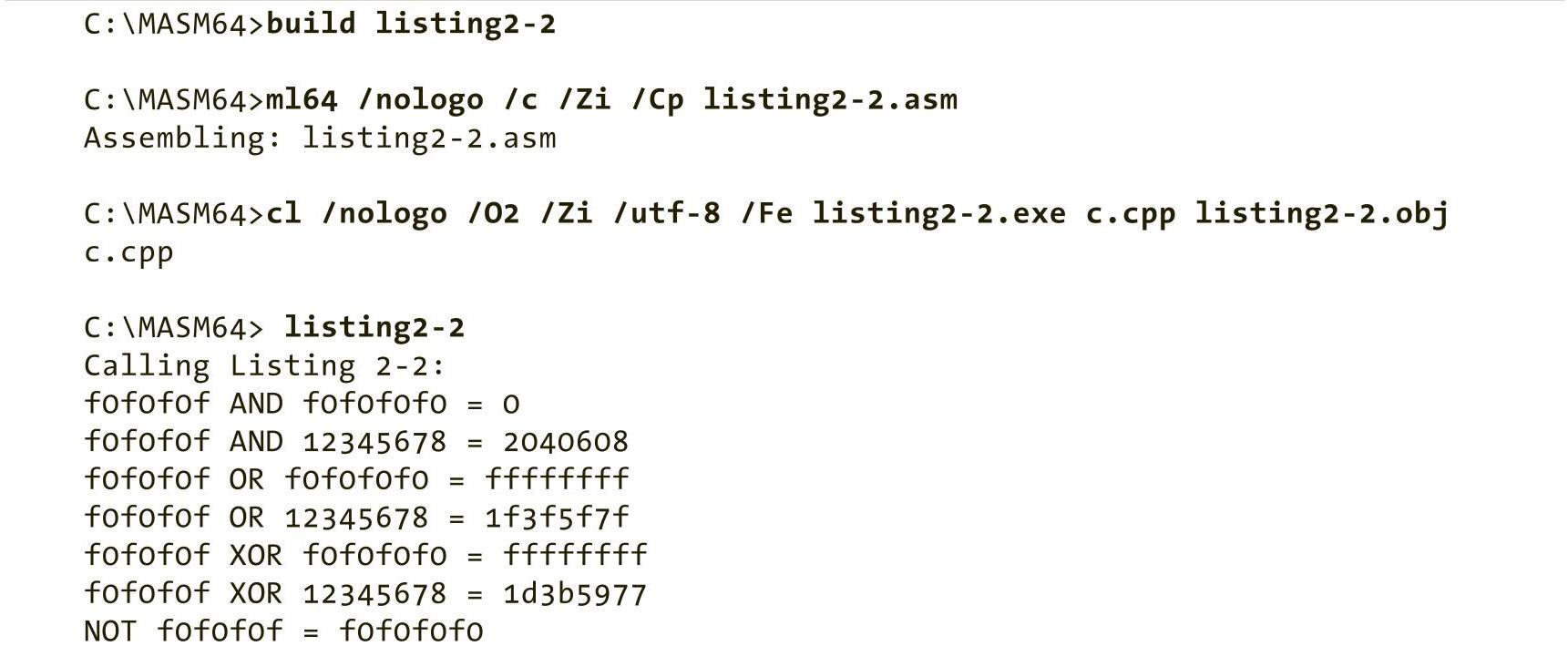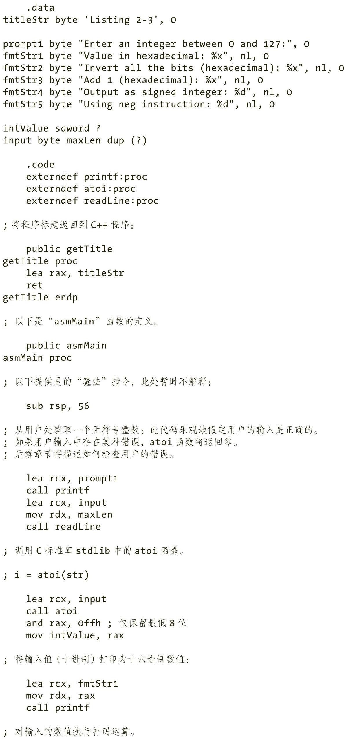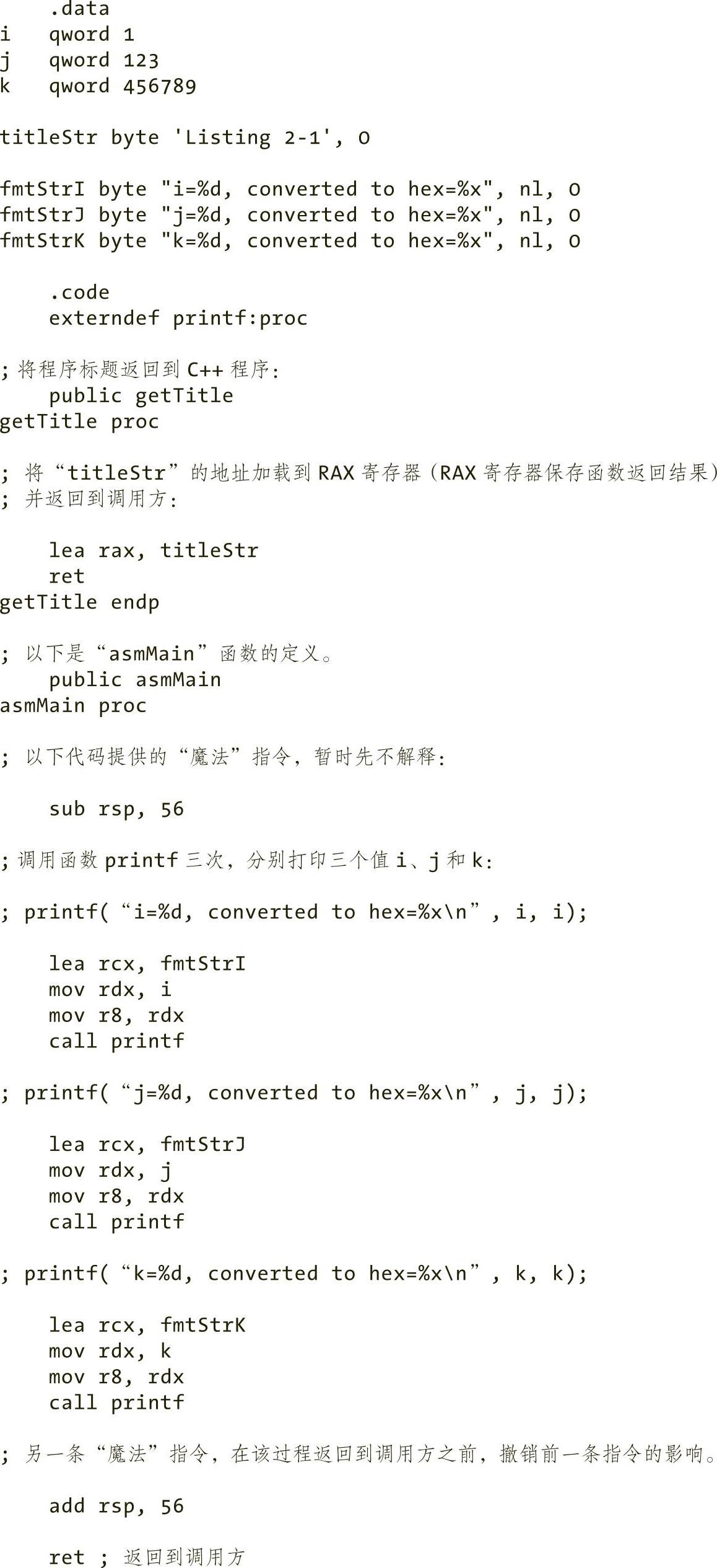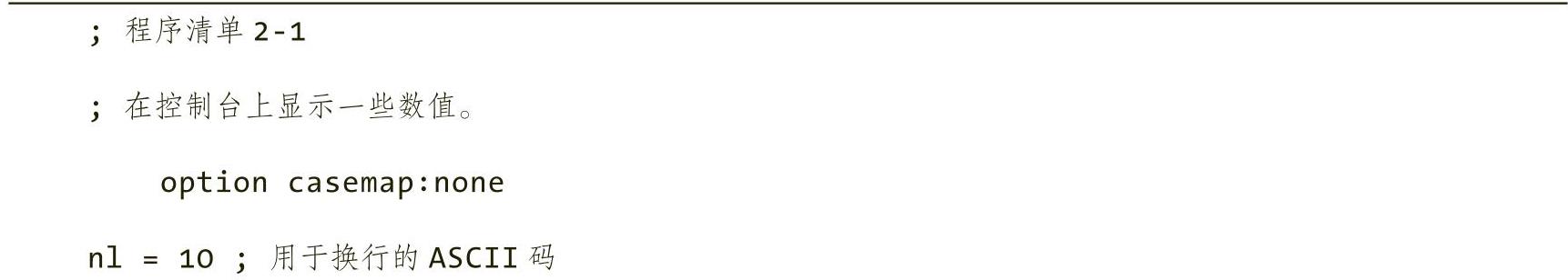 纯汇编语言没有通用的打印或者输出函数,可以调用打印或输出函数在控制台上将数字量显示为字符串。我们可以编写自定义的过程来处理这个显示过程(本书稍后将讨论其中的一些过程)。目前,本书中的MASM代码依赖于C标准库的printf()函数来显示数值。请阅读程序清单2-1中的程序,该程序将各种数值转换为其等价的十六进制数值。