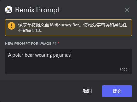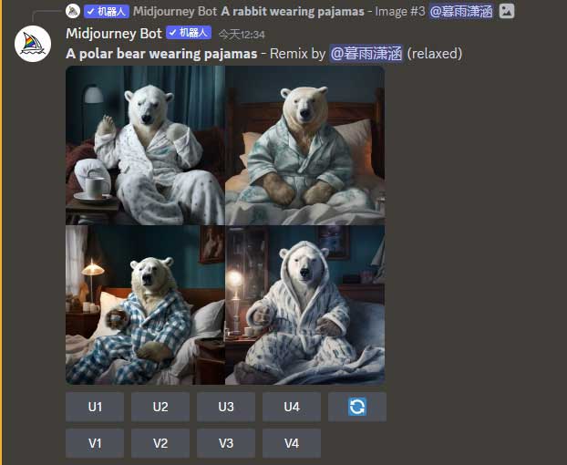在提示语弹窗中,将描述语修改为“A polar bear wearing pajamas”(一只穿着睡衣的北极熊),如图2-24所示。Midjourney输出的图像如图2-25所示。也可以通过“/prefer remix”指令开启或关闭Remix mode(混合模式)。